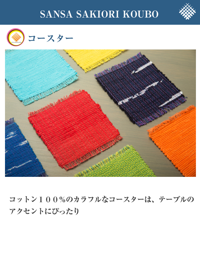 「盛岡さんさ踊り」では、企業毎にカラフルで色鮮やかな浴衣を着てパレードします。浴衣は数年毎にリニューアルされ、使い古された浴衣にお疲れさんの気持ちを込めて、新しい役割を与えます。それが、「さんさ裂き織」となり盛岡さんさ踊りの土産品として、県内外の方たちに大変喜ばれる商品となりました。
