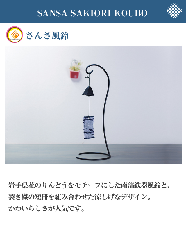 「盛岡さんさ踊り」の観る者を魅了するカラフルな浴衣は、企業や学校、有志のグループなどが、それぞれ趣向を凝らして作った揃いの浴衣。この「さんさ踊り」の浴衣生地と南部に伝わる「裂き織」の技術を融合させた「さんさ裂き織」を提案しています。